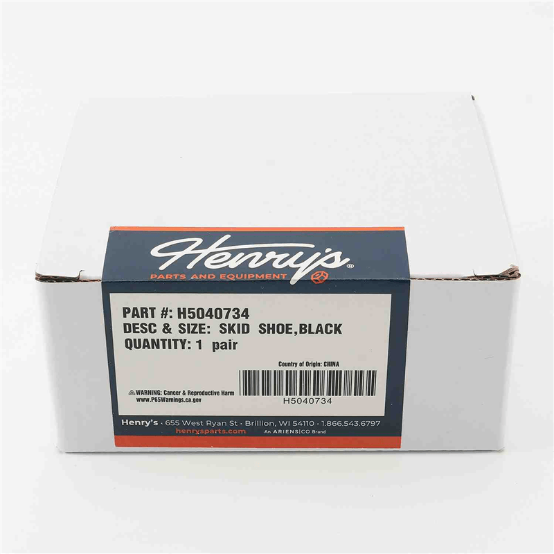 Two pack of black steel skid shoes. Henry’s replacement skid shoes are essential snow blower accessories designed to maintain machine height, protect equipment and surfaces from damage, ensuring efficient snow removal.